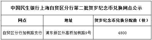中国民生银行上海自贸区分行第二批贺岁纪念币兑换网点公示